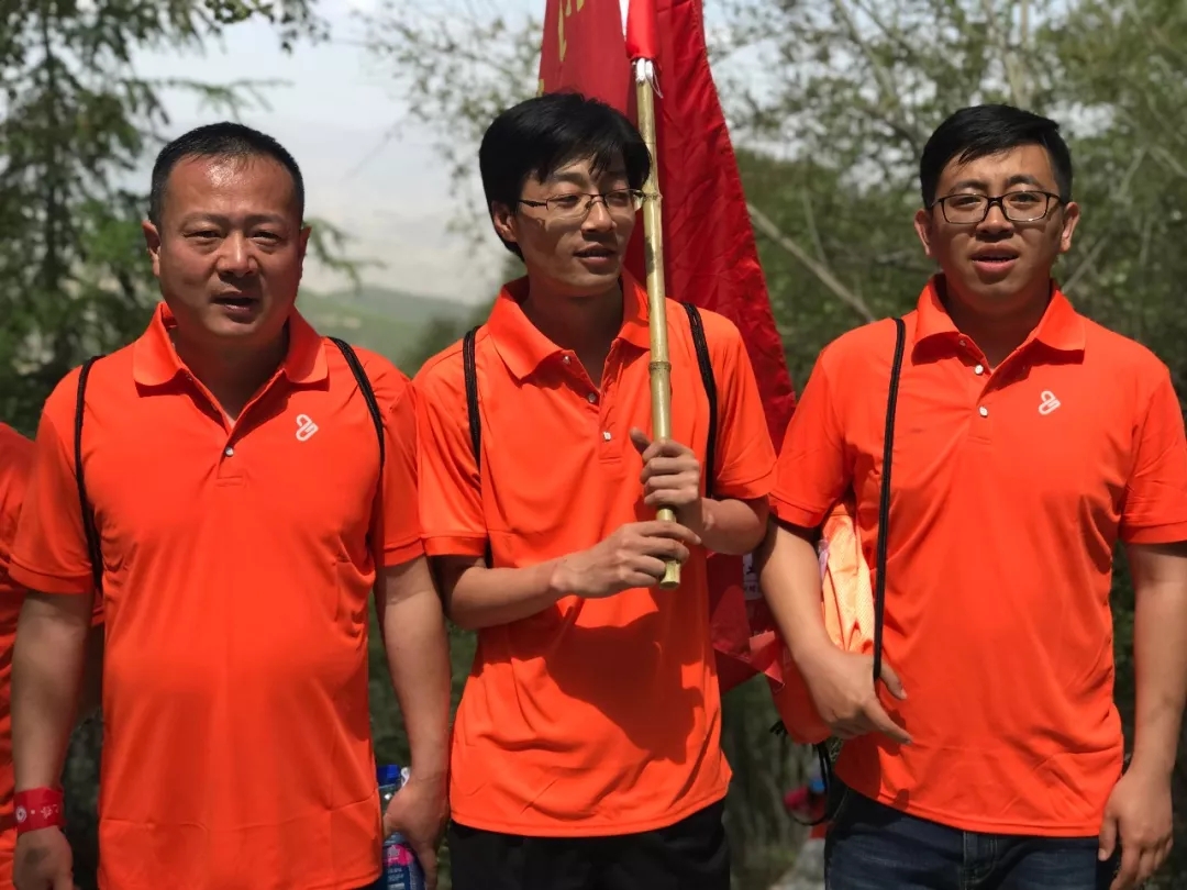 大家身着代表着企业的橙色上衣,肩扛代表各队的旗帜,